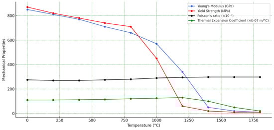 The elastic strain is formulated based on isotropic Hooke’s law, incorporating temperature-dependent variations in Young’s modulus and Poisson’s ratio. The plastic strain component is represented using a constitutive plasticity model characterized by the Von Mises yield criterion, also accounting for temperature-dependent material behavior []. The thermomechanical properties adopted in the simulation are presented in Figure 6.