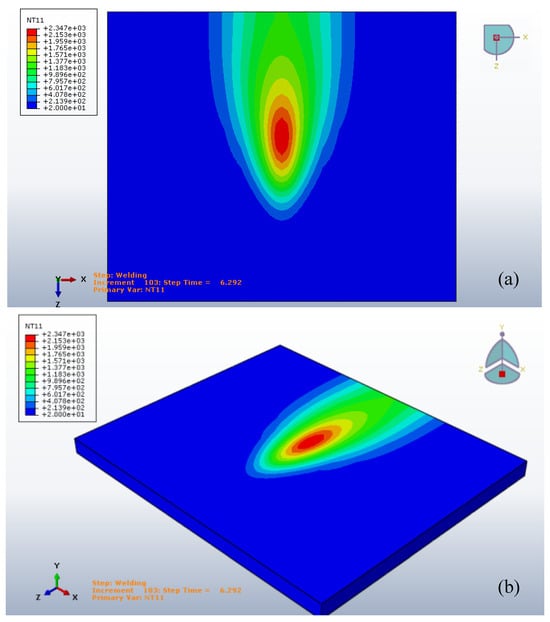 The temperature distribution of Goldak’s heat input at 6.292 s, (a) top view, (b) isometric view.