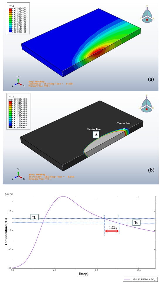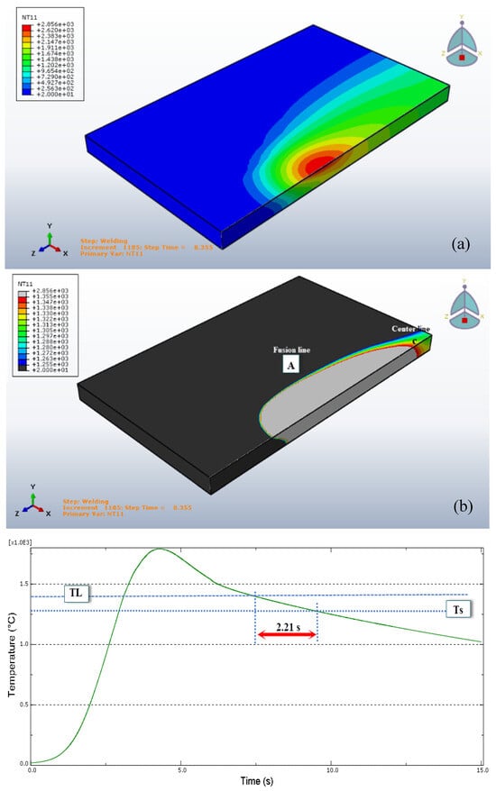 Figure 13 shows the weld profiles and thermal cycle during welding at 8.350 s using Goldak’s heat input model. Figure 13a illustrates the temperature distribution and solidification range around the weld. Figure 13b presents the thermal cycle at the fusion line (Point A), showing a 1.92-second solidification time between the liquidus (TL) and solidus (TS) temperatures.
