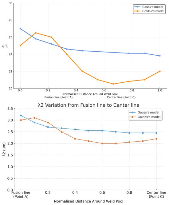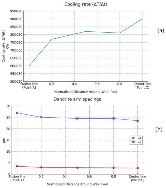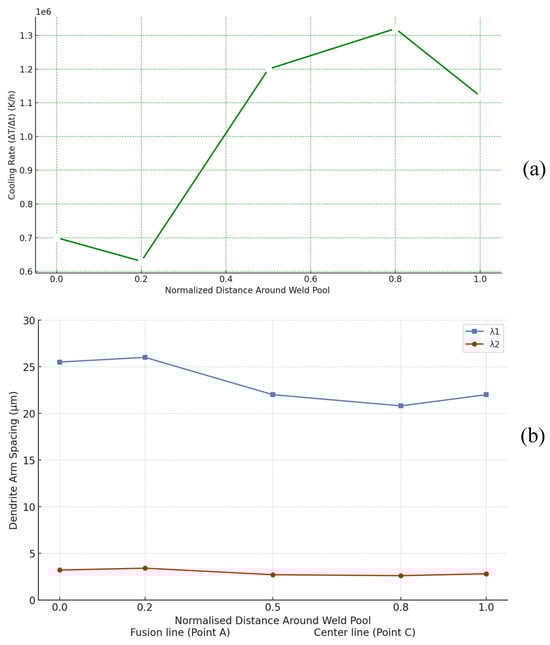 Figure 14 illustrates the predicted cooling rates and dendrite arm spacings around the weld pool at 8.350 s using Goldak’s heat input model. In Figure 14a, the cooling rate initially decreases slightly, then increases significantly, reaching a peak near the normalized distance of 0.8 before slightly declining toward the center line. Figure 14b shows the dendrite arm spacings, where the primary spacing (λ1) decreases from the fusion line toward the weld center, indicating finer microstructure in regions with higher cooling rates. The secondary spacing (λ2) remains relatively constant across the weld. These results highlight the inverse relationship between cooling rate and dendrite arm spacing.