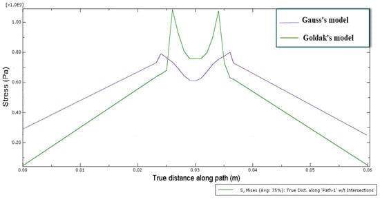 Figure 18 compares transverse stress distributions for Gauss’s and Goldak’s heat input models. The transposition of the transverse stresses in both heat inputs shows the changes. Gauss’s model shows a smoother, lower peak stress profile, while Goldak’s model produces sharper, higher stress peaks, indicating more localized heat effects.