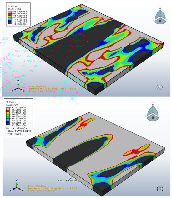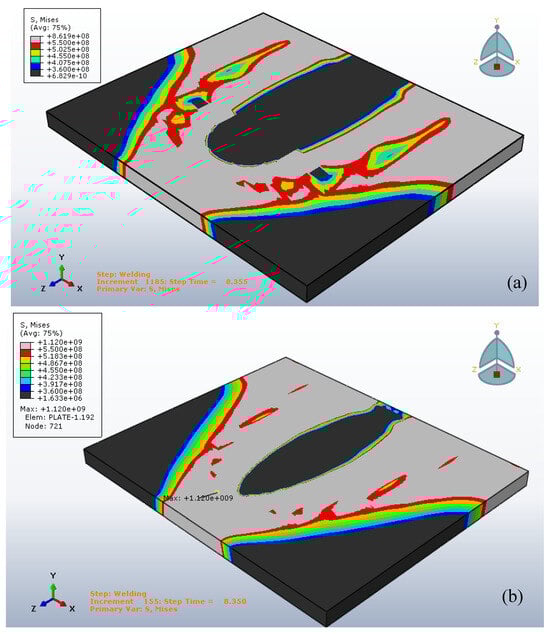 Von Mises stresses fields, (a) the Gaussian distribution at 8.355 s, (b) the Goldak’s heat input at 8.350 s.