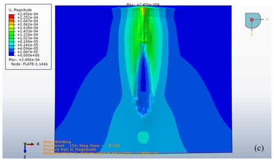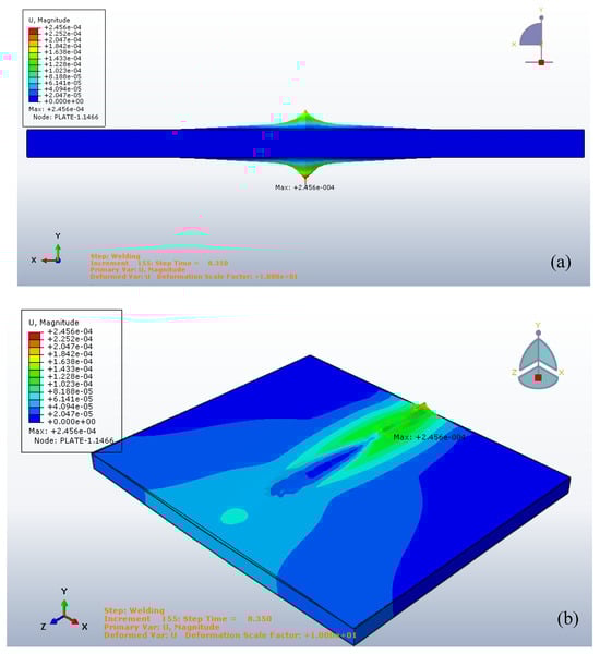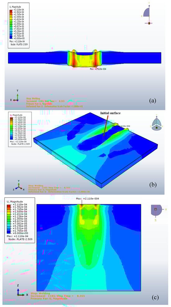 Displacement fields were magnified (by using a scale factor = 10) to show the distortions of the welded plates as shown in isometric view, in Figure 21 illustrate the displacement magnitude resulting from thermal and mechanical effects during the welding process of a metal plate. Figure 21a presents a longitudinal side view of the welded joint, showing the distribution of deformation along the X-axis. The highest displacement, approximately 2.118 × 10−4, occurs at the weld center, with a gradual reduction toward the edges, as indicated by the color gradient from red (maximum) to blue (minimum). Figure 21b offers a three-dimensional perspective of the deformation, highlighting the out-of-plane distortion relative to the initial surface profile. The region near the weld exhibits a noticeable bulge, indicating localized expansion due to heat input. The labeled arrow marks the initial undeformed surface, clearly demonstrating the extent of warping. Figure 21c provides a top-down view, illustrating the deformation pattern in the transverse (Z) and depth directions. The contour distribution reveals a symmetrical spread of displacement from the weld centerline, with the intensity diminishing outward, reflecting the thermal gradient and material response in the heat-affected zone.