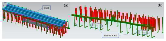 - Farhang Mehr, F.; Cockcroft, S.; Reilly, C.; Maijer, D. Investigation of the Efficacy of a Water-Cooled Chill on Enhancing Heat Transfer at the Casting-Chill Interface in a Sand-Cast A319 Engine Block. J. Mater. Process. Technol. 2020, 286, 116789. [Google Scholar] [CrossRef]