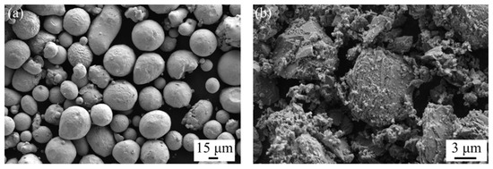 We selected 7075 alloy substrate pipe with dimensions of 1000 × 140 × 10 mm3 (length × diameter × thickness), and the relevant elemental composition is listed in Table 1. The substrate was ground to remove the surface oxide and oil staining before the HLC experiment. The 5 wt% flaked and blocky TiC (purity > 99.9%, Shanghai Maoguo Nano Technology Co., Ltd., Shanghai, China), with particle size distribution of approximately 10 μm, was added to Cu powder (purity > 99.9%, Chengdu Ketailong Alloy Co., Ltd., Chengdu, China), with particle size distribution of approximately 25 μm, using an electronic balance. Figure 1 shows the Cu and TiC powder. The spherical shape of the Cu particle ensured the powder’s fluidity during the HLC powder feeding process. The composite powder was mixed evenly and put into a drying oven, then dried at a temperature of 120 °C for 2 h. Considering the strengthening effect of TiC on Cu coating, a small amount of TiC was selected for the preliminary process exploration to reduce the experimental variables.