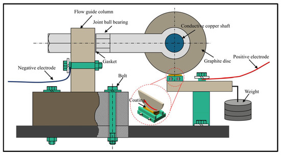 The current-carrying friction-wear tests were carried out on the coatings using a self-designed current-carrying wear tester, where the E-22 graphite disc with the dimension of Ø150 × 10 mm was used as the friction pair to simulate the carbon brush in the conductive slip ring, as shown in Figure 2. The entire current-carrying friction system was powered by 220 V alternating current (AC), and the tests were conducted in a room temperature environment (25 ± 5 °C). The parameters of the friction-wear test are as follows: rotation speed of 250 r/min; normal load of 5 N; test time of 30 min; and working electric currents of 25 A. The working principle of the tester was as follows: the positive electrode wire was connected to the lever, and the negative electrode was connected to the guide column, which was fixed by bolts. The normal loads were applied by hanging weights at the right end of the lever. The electric current passed through the contact area between the coating and graphite disc to produce current-carrying friction. The copper conductive shaft, mounted on the front surface of the graphite disk, efficiently conducted the electrical current to the flow guide column, which directed the current into the negative terminal. This optimized configuration enhanced the thermal dissipation capacity by expanding the effective heat transfer area, thereby effectively mitigating the adverse effects of Joule heating generated by current-carrying friction wear on the operational stability of the testing apparatus. The calculation formula of wear rate (W) is [32]