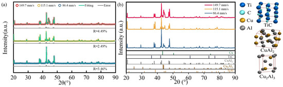 XRD patterns of Cu–TiC coatings through high-speed laser cladding. (a) refinement peak, and (b) phase identification.
