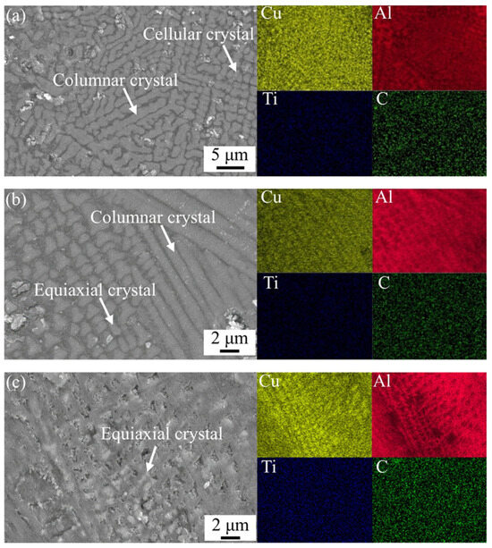 - Elevated scanning speeds effectively inhibit the formation of the CuAl2 phase on the Cu–TiC coating, while the content of the Cu2Al3 phase exhibits a corresponding increase, and the microstructure of the coating undergoes a progressive evolution from cellular and columnar crystals → columnar and equiaxed crystals → ultimately, fully equiaxed crystals with scanning speeds increasing from 86.4 mm/s to 149.7 mm/s. The highest coating quality is achieved at a scanning speed of 149.7 mm/s, but the rapid solidification due to the high scanning speed led to elemental segregation of the coating.