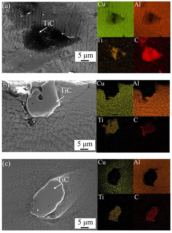 Figure 4 displays the morphologies and mapping analysis of the Cu–TiC coating prepared through high-speed laser cladding. The microstructure evolution of coatings at the scanning speeds of 86.4, 115.1, and 149.7 mm/s consisted of cellular crystals + columnar crystals, columnar crystals + equiaxed crystals, and equiaxed crystals, respectively. The microstructure of the material was closely related to the temperature gradient (G) and solidification rate (R) during the HLC process. The increase in the scanning speed of coatings reduced the molten pool existence time at high temperatures, which accelerated the R and the undercooling degree of the coating and increased the nucleation rate, eventually leading to the coating microstructure change. The results of mapping analysis also illustrated that the excessive cooling rate of the coating caused the elemental segregation of equiaxed crystals as the scanning speed reached 149.7 mm/s. Figure 5 shows the morphology and element distribution of the TiC particles in the Cu–TiC coatings created at different scanning speeds. It could be found that the TiC was distributed within the coating as blocky particles. At 86.4 mm/s, the high laser energy density caused partial melting of the TiC edges and element interdiffusion between the TiC particles and the coating. When the scanning speed increased to 115.1 mm/s, pores and gaps appeared near the TiC particles, indicating poor adhesion between them and the coating. As the scanning speed increased, the TiC particles were exposed on the coating surface without notable defects, showing strong bonding between the TiC particles and the coating.