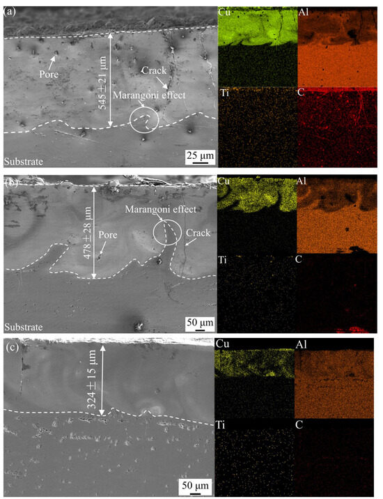 Figure 6 shows the cross-sectional morphologies and mapping analysis of the Cu–TiC coatings through high-speed laser cladding. The mapping analysis results show that the mutual diffusion of the Cu and Al elements indicate that a good metallurgical bond was formed between the coating and the substrate during the HLC process. The increase in scanning speed resulted in a shorter reaction time between the laser and the material, reducing the produced specific energy density (E) and the lower powder melting rate. The TiC in the form of the E of coating was calculated as follows [29]: