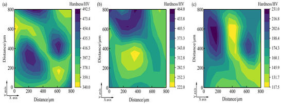 Average hardness of Cu–TiC coating surfaces through high-speed laser cladding: (a) 86.4 mm/s; (b) 115.1 mm/s; (c) 149.7 mm/s.