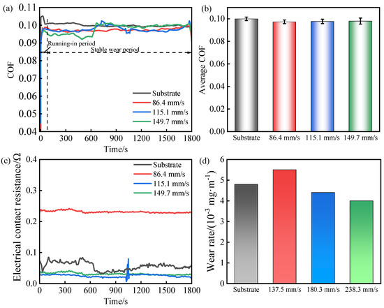 Tribological properties of Cu–TiC coatings fabricated through high-speed laser cladding under 25 A: (a) COF vs. sliding time; (b) average COF; (c) contact resistance vs. sliding time; (d) wear rate.