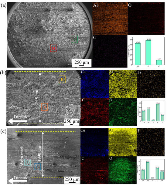 Figure 9 shows the mapping analysis of Cu–TiC coatings prepared through high-speed laser cladding under 25 A. Marked areas A and B represented the morphological characteristics of the 86.4 mm/s coating on the worn track, which will be analyzed in Figure 10. Marked areas C and D corresponded to the worn track morphologies of the 115.1 mm/s coating, which will be discussed in Figure 10. Marked areas E and F depicted the morphological details of the 149.7 mm/s coating on the worn track, and also required analysis in Figure 10. Finally, marked areas G and H illustrated the worn track morphologies of the substrate, and would be analyzed in Figure 10.