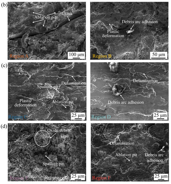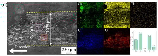 Figure 10c,d show the worn track morphologies of the Cu–TiC coatings at scanning speeds of 115.1 and 149.7 mm/s, respectively. The number and area of the ablation pits on the worn track decreased significantly compared those observed in Figure 10a, which can be attributed to the coating’s (115.1 and 149.7 mm/s) low contact resistance and high conductivity. The higher conductivity materials reduced the arc discharge probability [42], thereby decreasing the coating wear from electrical erosion. Around the ablation pits, the coating material preferentially underwent shearing, deformation, and tearing under the stress, expanding the pit dimensions and forming spalling pits. Oxidized wear debris from the frictional heating adhered to the spalling pits, forming protective deposits that arrested ablation pit growth. Additionally, the degree of plastic deformation on different regions of the worn tracks was also different, leading to the delamination of the coating, which will be discussed further in the next section.