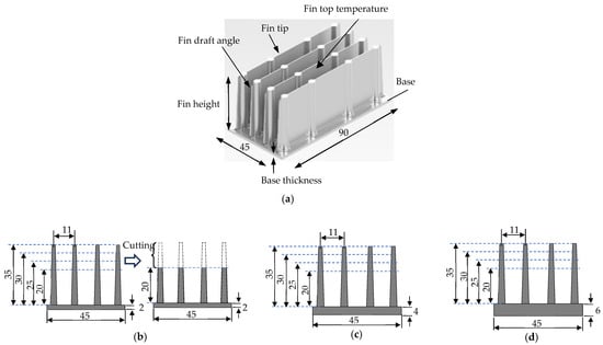 Schematic diagram of heat sinks used in investigation for heat dissipation. (a) Overview of heat sink. (b) Heat sink with 2 mm base thickness and fabrication of a heat sink with 20 mm fin height from 35 mm fin height by cutting the fin tips. (c) Heat sink with 4 mm base thickness. (d) Heat sink with 6 mm base thickness. Units: mm.