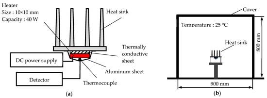 The mounting method for the heater, thermocouple, detector and aluminum sheet is shown in Figure 2a. A square-shaped micro-ceramic heater (MS-3, Sakaguchi, Akihabara, Tokyo, Japan) measuring 10 mm on each side was attached to the back of the heat sink and operated at 40 W. A DC stabilized power supply (PSF-400L2, Texio, Yokohama City, Kanagawa Prefecture, Japan) was used to heat the micro-ceramic heater. A 0.5 mm thick thermal interface material sheet (EX20000C7, Dexerials, Shimotsuke city, Tochigi Prefecture, Japan) was inserted between the heat sink and the micro-ceramic heater. The temperature of the micro-ceramic heater, defined as that 30 min after saturation, was measured using a T-type thermocouple. Heat dissipation was measured three times for each size of both white and black heat sinks, with a lower heater temperature indicating better performance. The equipment used to maintain the temperature uniformity is shown in Figure 2b.