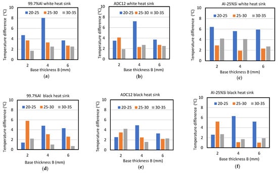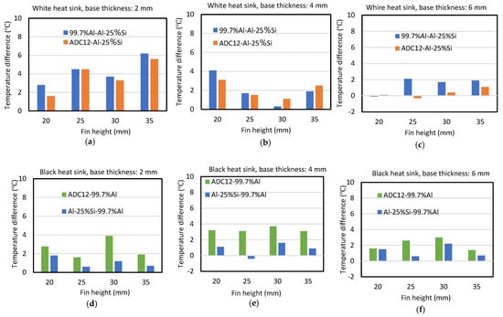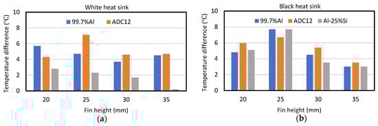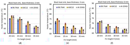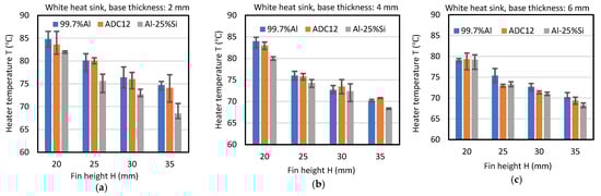 For the white heat sinks, the performance was better in the order of Al-25%Si, ADC12 and 99.7%Al, as shown in Figure 3a–c. For the black heat sink, the performance was better in the order of 99.7%Al, Al-25%Si and ADC12, as shown in Figure 3d–f. The effects of the fin height and the base thickness on the superiority of the Al-25%Si white heat sink over the ADC12 and 99.7%Al white heat sinks, and of the 99.7%Al black heat sink over the ADC12 and Al-25%Si black heat sinks, was investigated.
