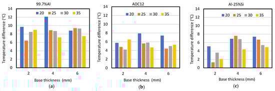The temperature difference for “99.7%Al-Al-25%Si” was smaller than that for “ADC12-Al-25%Si” because the difference in thermal conductivity between 99.7%Al and Al-25%Si was smaller than that between 99.7%Al and ADC12.