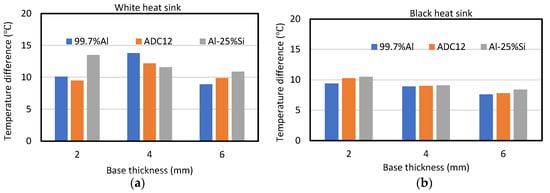 The heater temperature for the Al-25%Si white heat sink or the 99.7%Al black heat sink was subtracted from the heater temperatures of the other aluminum alloys’ heat sinks to calculate the temperature differences. The superiority of the Al-25%Si white heat sink or the 99.7%Al black heat sink increased as the temperature difference increased. In other words, as the temperature difference decreased, the inferiority of the other heat sinks decreased. In Figure 9, for example, “99.7%Al-Al-25%Si” means that the heater temperature of the Al-25%Si heat sink was subtracted from that of the 99.7%Al heat sink.