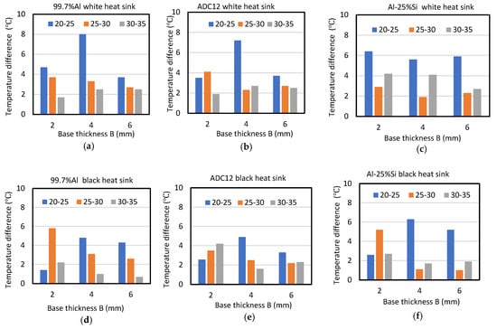 Reduction in temperature with 2 mm increases in base thickness, from 2 mm up to 6 mm, for white and black heat sinks. (a) 99.7%Al white heat sink, (b) ADC12 white heat sink, (c) Al-25%Si white heat sink, (d) 99.7%Al black heat sink, (e) ADC2 black heat sink and (f) Al-25%Si black heat sink.