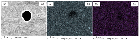 SE image (a) and chemical analysis mapping for Al and Mn (b,c) utilizes EDS to examine AlN precipitates in the size range of several hundred nanometers in alloy B21Al88 after annealing at 1100 °C for 1800 s.