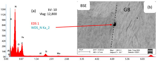 Figure 7 shows a corresponding EDS/WDS analysis of a BN precipitate (b), typically located at an austenite grain boundary, in alloy Al36B44 after annealing for 1800 s at 1200 °C. The spectrum (a) from the WDS analysis shows the presence of N.