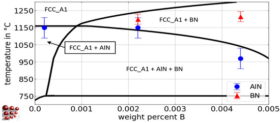The blue circles and red triangles represent the experimental results from Section 4.2.1 for the Tsol of AlN and BN, respectively. The Tsol of BN for the alloys B21Al0, B19Al35, and B21Al88 lies within a narrow range, as evidenced by the experimental results. From a thermodynamic perspective, the higher affinity of boron for nitrogen compared to aluminum [8,77] elucidates the amount of aluminum necessary to restrict the solubility of BN in austenite [7], with approximately 0.09 wt.-% required to entirely impede BN formation. Figure 8 shows the pseudo-binary Fe-B diagram for the Fe-rich side of the system Fe-C-N-Al-B with 0.5 wt.-% C, 79 wt.- ppm N, and 0.03 wt.-% Al for the austenite region. These calculations are derived from the thermodynamic database ME-Fe_CDLIPE2.0.2.tdb [18]. The blue circles and red triangles represent the experimental results from Section 4.2.1 for Tsol of AlN and BN, respectively.
