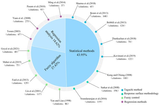 This section analyzes the citation trends of WEDM process-optimization research, with a focus on the methods used, as shown in Figure 4. As depicted, most scholars focus on statistical methods (such as Taguchi’s method and response surface methodology), as well as fuzzy control methods. This research preference primarily stems from the need to adapt to the complexity of WEDM processes: Taguchi’s method efficiently optimizes multivariable systems through orthogonal experimental design, response surface methodology constructs nonlinear models to balance multi-objective conflicts (such as machining efficiency and surface quality), and fuzzy control addresses uncertainty (such as discharge gap fluctuations) through fuzzy logic. These methods’ comprehensive advantages in nonlinear modeling, multi-objective optimization, and real-time adjustments make them the mainstream choices for process optimization. Moreover, in wire electrical-discharge machining, the dynamic coupling of process parameters (such as discharge energy and electrode wear) demands higher robustness for control models. Notably, compared to traditional methods such as linear regression, the citation frequency of the above-mentioned methods is significantly higher. This trend can be attributed to the fact that linear regression relies on strict linear assumptions and static analytical frameworks, thus making it difficult to capture the complex nonlinear relationships and time-varying characteristics between parameters in WEDM (such as accumulated thermal deformation during the machining process). In contrast, Taguchi’s method, response surface methodology, and fuzzy control, through experimental design, higher-order modeling, rule reasoning, and dynamic feedback mechanisms, are better suited to the strong nonlinearity and real-time requirements of the process, thus dominating both theory and practice.