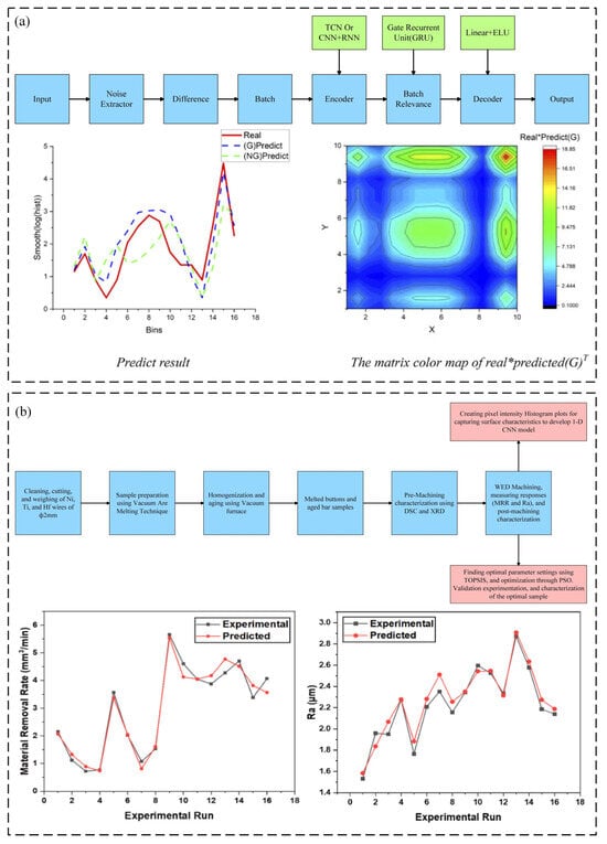 (a) BRTCN model framework diagram, (256-BR (gru)TCN-NE) model prediction results, and the matrix heatmap of real values vs. predicted values (G) (Reprinted with permission from Ref. []. Copyright 2022, Elsevier). (b) Workflow diagram and comparison analysis of CNN model’s predicted MRR and Ra values with experimental data (Reprinted from Ref. []).