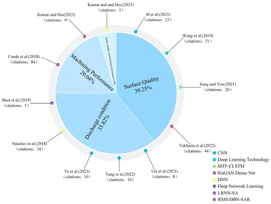 Secondly, in the optimization of surface quality in WEDM (wire electrical discharge machining) processes, recent research has demonstrated the significant application of deep learning technologies in accurately detecting and predicting surface features. The following studies further advance this field and showcase the potential of combining deep learning with WEDM technology. Wang et al. [] proposed a new method for detecting tolerance defects in turbine disc keyway machining, marking the first application of deep learning technology in the WEDM field. Their study involved machining industrial-grade turbine disc keyways and comparing the defect-prediction results from deep neural networks with traditional measurements from a CMM. The results depicted that, within the strict ±5 µm tolerance range, the network’s predictions were highly consistent with the traditional CMM results in 80% of the regions. Jiang and Yen [] proposed a method called MTF-CLSTM, which combines Markov Transition Field (MTF), CNN, and Long Short-Term Memory Networks (LSTMs) to achieve accurate prediction of product quality after WEDM machining. Experimental results revealed that, under three-, four-, and five-state MTF, the MAPE of the method was 3.11%, 2.94%, and 3.24%, respectively, outperforming DNN and MC-DNN methods under the same experimental conditions and significantly improving prediction accuracy. Vakharia et al. [] employed WEDM to machine nickel–titanium alloy bars and analyzed surface features using Field-Emission Scanning Electron Microscopy. They also applied Single-Image Generative Adversarial Networks (SinGANs) and Dense Net deep learning models to predict surface morphology and its correlation with machining parameters. The results indicated (as shown in Figure 9b) that the Dense Net model achieved a 100% average accuracy during both the training and testing phases, accurately predicting surface images. The model also achieved a 100% recognition rate in the other three metrics, performing best in surface morphology prediction. The next best-performing models were Alex Net (99.8%), KNN (99.4%), and MNB (98.9%).