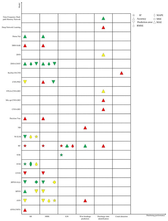 In recent years, AI technologies have been increasingly applied in advanced manufacturing, and DNN methods have been adopted to optimize the WEDM process to improve machining performance and surface quality. Kumar and Das [] experimentally analyzed the effects of P-OFF, P-ON, SV, and IP on MRR, recast layer thickness (RLT), and Ra, comparing the results with the RSM model. A hybrid DNN model based on ANOVA and MRFO was applied to improve prediction accuracy. The results demonstrated that the DNN+MRFO method achieved an average prediction accuracy of 90%. The maximum MRR obtained experimentally was 2.657 mm3/min, with the minimum RLT and Ra being 7.9 µm and 0.351 µm, respectively. Regression analysis indicated that the DNN+MRFO model outperformed the RSM, with expected values of 0.844 (RSM) and 0.921 (DNN+MRFO) in the validation analysis. Meanwhile, Kumar and Das [] proposed a hybrid model combining DNN with the COOT optimization algorithm (DNN+COOT) to predict the MRR, microhardness (MH), Ra, and RLT performance indicators for UV-WEDM machining of AISI P20+Ni. The process parameters were optimized using the RSM, and the prediction performance was compared with traditional DNN and RSM models. The results showed that the DNN+COOT method achieved a prediction accuracy of 98.77%, significantly improving upon traditional DNN. The optimized UV-WEDM process could maximize MRR and MH (46% and 5–6% improvements, respectively) and minimize Ra and RLT (Ra improved by up to 69%) at a desirability of 0.65. The experimental error did not exceed 2%. The prediction errors of DNN+COOT were significantly reduced (RMSE: MRR, 0.0293; MH, 0.0292; RLT, 0.0276; and Ra, 0.0268), whereas the RMSE values of traditional DNN and RSM methods were higher (0.326 and 0.479, respectively). Therefore, DNN+COOT demonstrated outstanding performance in predicting UV-WEDM processing parameters.