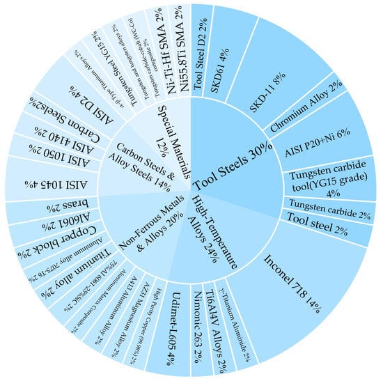 According to the literature reviewed in this Section, Table 1 provides a detailed overview of various metallic materials used in the WEDM process and summarizes the research on process optimization for them. The materials involved include high-temperature alloys, tool steels, carbon steels, and alloy steels. Table 1 presents the key parameters of interest during the machining process, such as MRR and Ra. To optimize this machining performance, a wide range of optimization methods have been applied in research, such as Taguchi’s method combined with multi-response signal-to-noise ratio, RSM, and linear regression analysis combined with GA, and ANFIS, among others. In the study of Inconel 718, for example, Ramakrishnan and Karunamoorthy [] applied Taguchi’s method with multi-response signal-to-noise ratio optimization, which significantly improved both MRR and Ra. The study reported a 1.11-fold increase in MRR and a reduction of Ra by 1.09 µm. In the research on AZ31 magnesium alloy, Kavimani et al. [] adopted Taguchi’s method combined with GRA to optimize machining parameters, achieving ideal results under conditions such as P-ON = 40 μs. These methods assist researchers in making precise parameter adjustments based on the material characteristics and processing conditions, thus improving machining efficiency and surface quality. Each study meticulously documents the performance changes in different materials during the machining process, particularly the improvements in MRR and surface quality after optimization. These results show that the composition, hardness, conductivity, and other physical properties of the material significantly affect the machining process. Therefore, these factors must be considered when developing machining plans. It is especially important to note that there is often a trade-off between speed and accuracy, which requires the selection of appropriate machining parameters and optimization methods when processing different materials to achieve the best machining outcomes. Overall, these research findings provide valuable references for the application of WEDM technology in machining various metallic materials, emphasizing the importance of tailoring parameters to the specific material type and machining requirements. This not only helps improve production efficiency but also ensures high-quality machining results.