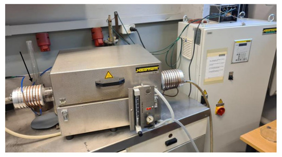 The flat surfaces of AISI 316L steel samples (Table 1), in the form of ϕ 25 × 6 mm discs cut from a round bar were ground with 240 to 1200 grit abrasive SiC papers (Lam Plan, Gaillard, France), then polished with a 1 μm diamond suspension (Lam Plan, Gaillard, France) and finally degreased in acetone (Chempur, Piekary Śląskie, Poland) using an ultrasonic cleaner (Intersonic, Olsztyn, Poland). The oxide layers were formed by heating the steel in air at three temperatures—400 °C, 450 °C and 500 °C—for 6 h at atmospheric pressure using a tube furnace (Nabertherm, Lilienthal, Germany) (Figure 1).