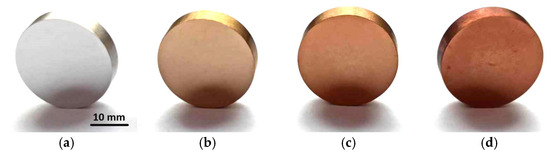 Figure 2 shows the surface appearance of austenitic steel after oxidation in an open furnace under air atmosphere. The initial state exhibits a silver color, typical of polished austenitic steel (Figure 2a). After oxidation at 400 °C, the colour changed to light gold (Figure 2b). A further increase in process temperature darkens the gold shade (Figure 2c), and steel oxidized at 500 °C acquires a rose gold hue (Figure 2d). The darker color may suggest that the layer formed after oxidation is thicker. Oxidation imparts an additional aesthetic appeal to AISI 316L steel.