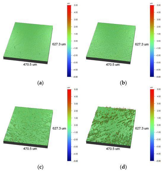 The 3D images shown in Figure 3 confirm the increase in surface development with the rising in oxidation temperature of the 316L austenitic steel, which made the material more uneven due to oxide formation. The shift from light gold to dark gold shades (Figure 2b–d) may also be due to the significant surface development (Table 2, Figure 3).
