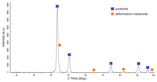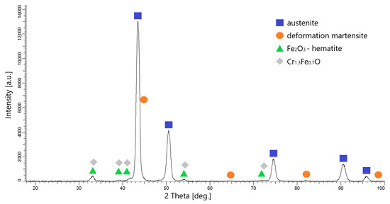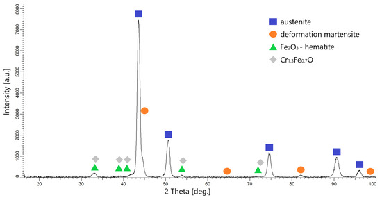 Figure 4 shows X-ray diffraction patterns for the steel in its initial state, and Figure 5 and Figure 6 present patterns for steel oxidized at 400 °C and 500 °C, respectively. All patterns for oxide layers were similar with no significant differences in peak intensities and positions. AISI 316L steel was composed of austenite and deformation martensite, which formed in the surface layer as a result of grinding and polishing (Figure 4). Due to the pressure exerted on the sample surface during mechanical preparation, a martensitic transformation induced by plastic deformation occurred (TRIP effect) [12,39,40,41,42]. The XRD analysis confirmed the presence of oxide layers on the steel surface after oxidation processes (Figure 5 and Figure 6). At all process temperatures (400 °C, 450 °C, and 500 °C), two types of oxides were detected (Fe2O3 (hematite) and Cr1.3Fe0.7O3) and their peaks in each variant were of very low intensity. Another phase identified after the oxidation processes was austenite originating from the substrate. The peaks from austenite showed high intensity, and those from oxides were relatively low, indicating that the layers were very thin. This interpretation is supported by the low incident angle of 2° used during XRD. Due to their very small thickness, the oxide layers could not be observed on cross-sections by SEM. Deformation martensite is still visible after oxidation at 400 °C (Figure 5), but its peaks disappear after oxidation at 500 °C (Figure 6), owing to the reverse transformation of martensite to austenite at that temperature.