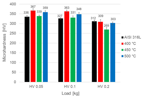Microhardness of AISI 316L steel surface in the initial state and after oxidation processes at temperatures of 400 °C, 450 °C and 500 °C.