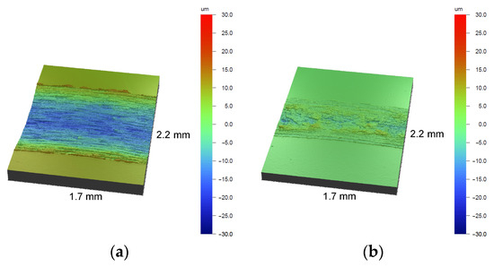 Surface topography and roughness of the produced layers were characterized with a Wyko NT9300 optical profilometer (Veeco, Plainview, NY, USA), measuring the Ra (arithmetic mean deviation of the profile from the mean line) and Rz (the sum of the arithmetic mean height of the five highest elevations above the mean line and the average depth of the five lowest depressions below the mean line) parameters at 10× magnification using Vision software, version 4.10. Five roughness measurements were performed for each sample variant, and selected 3D images of the sample surfaces were presented.