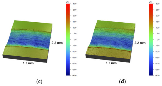3D images of wear tracks of the polished surface of AISI 316L steel in its initial state (a) and after oxidation processes at temperatures of 400 °C (b), 450 °C (c) and 500 °C (d).