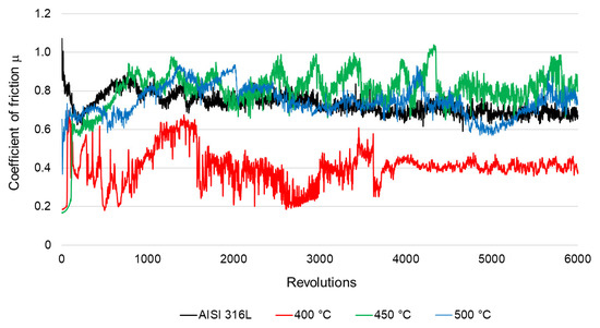 Friction coefficient versus the number of revolutions of AISI 316L steel in the initial state and after oxidation processes at temperatures of 400 °C, 450 °C and 500 °C.