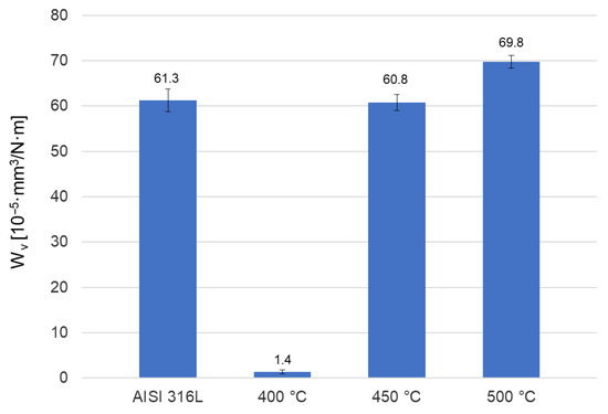 Wear rate of AISI 316L steel in the initial state and after oxidation processes at temperatures of 400 °C, 450 °C and 500 °C.