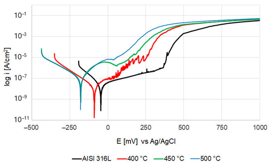 Polarization curves of AISI 316L steel in the initial state and after oxidation processes at temperatures of 400 °C, 450 °C and 500 °C.