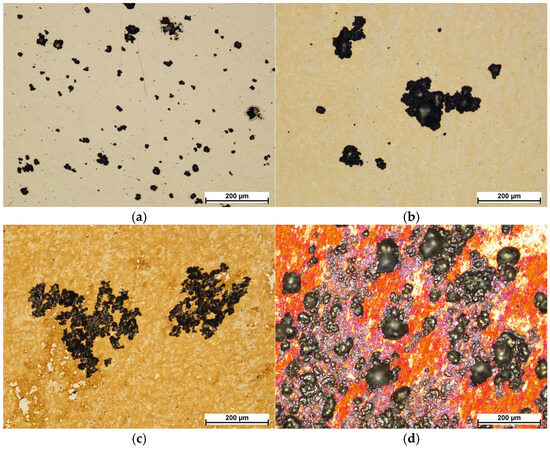 The number and size of pits correlate with the values of the breakdown potential (Table 3). It can be seen that the lower the value of the breakdown potential Epit, the greater the number and size of pits. The influence of surface development (Table 2) cannot be ignored, as it could have impacted the deterioration of corrosion resistance. With the increase in process temperature and roughness, there could have been more areas prone to easier propagation of pits, especially in recesses, which resulted in a greater number and size of pits with increasing roughness. A change in the color of the steel surface after the oxidation processes was also visible, which is related to the formed iron and chromium oxides (Figure 13b–d). In the case of layers oxidized at 450 and 500 °C, bright areas were observed where the oxide layers were most likely dissolved during potentiodynamic tests (Figure 13c,d). Such areas become anodic sites where preferential pitting propagation may occur. In the case of the layer formed at 400 °C, no such dissolution was observed, which again confirms its high homogeneity. The resulting pitting could have initiated in small, single defects in its structure, hence a smaller number of corrosion damages in this case (Figure 13b) compared to AISI 316L steel in the initial state (Figure 13a).