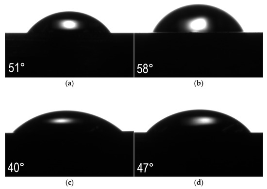 The contact angle tests performed did not show a clear trend linking this parameter to the increase in steel oxidation temperature (Figure 14). All tested sample variants exhibited smaller or larger hydrophilic properties (<90°). The highest contact angle, approximately 58°, was displayed by the surface oxidized at 400 °C (Figure 14b). The next largest angle, about 51°, was obtained for the polished AISI 316L steel in its initial state (Figure 14a). Lower contact angle values, indicating greater hydrophilic properties, were observed for the steel after oxidation at 450 °C and 500 °C, measuring approximately 40° and 47°, respectively (Figure 14c,d).