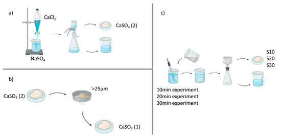 For the precipitation experiments, five seeds were evaluated. Two of the seeds were based on the methodology of Chagwedera, Chivavava, and Lewis (2022) [12]. These seeds were prepared with the addition of a 0.6 mol/L solution of CaCl2 to a 0.6 mol/L solution of Na2SO4 at 70 °C and then filtered (0.45 µm). The crystals formed were washed four times with ultrapure water to remove the NaCl and analyzed. The seed labeled CaSO4 (1) (Figure 1b) is this seed passed through a 25 µm sieve to have a more similar size to the other seeds evaluated, and the CaSO4 (2) (Figure 1a) seed was the original size (39 µm). The other 3 types of seeds (Figure 1c) were recirculated from the process formed in the 10, 20, and 30 min experiments.