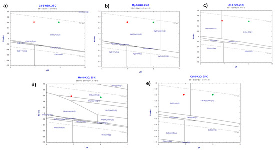 Diagrams of Eh/pH prepared in Factsage 8.3 for (a) Ca-S-H2O, (b) Mg-S-H2O, (c) Zn-S-H2O, (d) Mn-S-H2O, and (e) Cd-S-H2O.