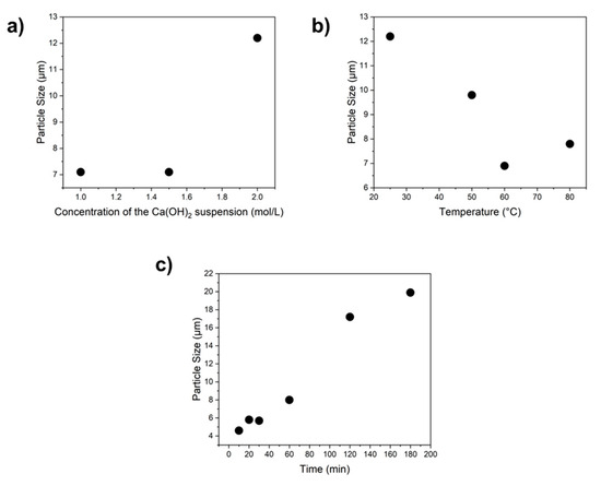 The effect of the concentration of Ca(OH)2 suspension (a), temperature (b), and time (c) on the particle size.