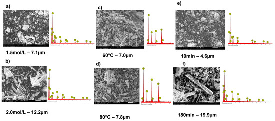 SEM images and EDS spectrum of precipitates formed in 1.5 mol/L (a), 2.0 mol/L (b), 60 °C (c), 80 °C (d), 10 min (e), and 180 min (f) experiments.