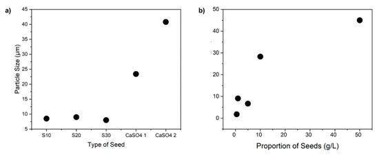 The CaSO4 (2) seed exhibited a higher increase in the particle size (approximately 400% higher, Figure 6a and Table 5) in comparison with other seeds (S10, S20, and S30) due to the presence of other metals (e.g., Mn, Zn, and Mg) promoting a heterogeneous primary crystallization while the CaSO4 (2) was only constituted by calcium sulfate [2]. A heterogenous primary crystallization has an increased nucleation rate, creating smallernucleus instead of promoting crystallization on the seed, which was the aim. The difference between the results achieved by CaSO4 (1) (23.4 µm) and CaSO4 (2) (40.8 µm) also demonstrated that the seed size influences the particle size.