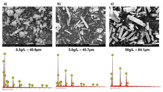 SEM images and EDS spectra of precipitates formed in 0.5 g/L (a), 5.0 g/L (b), and 50.0 g/L (c) seed proportions experiments.